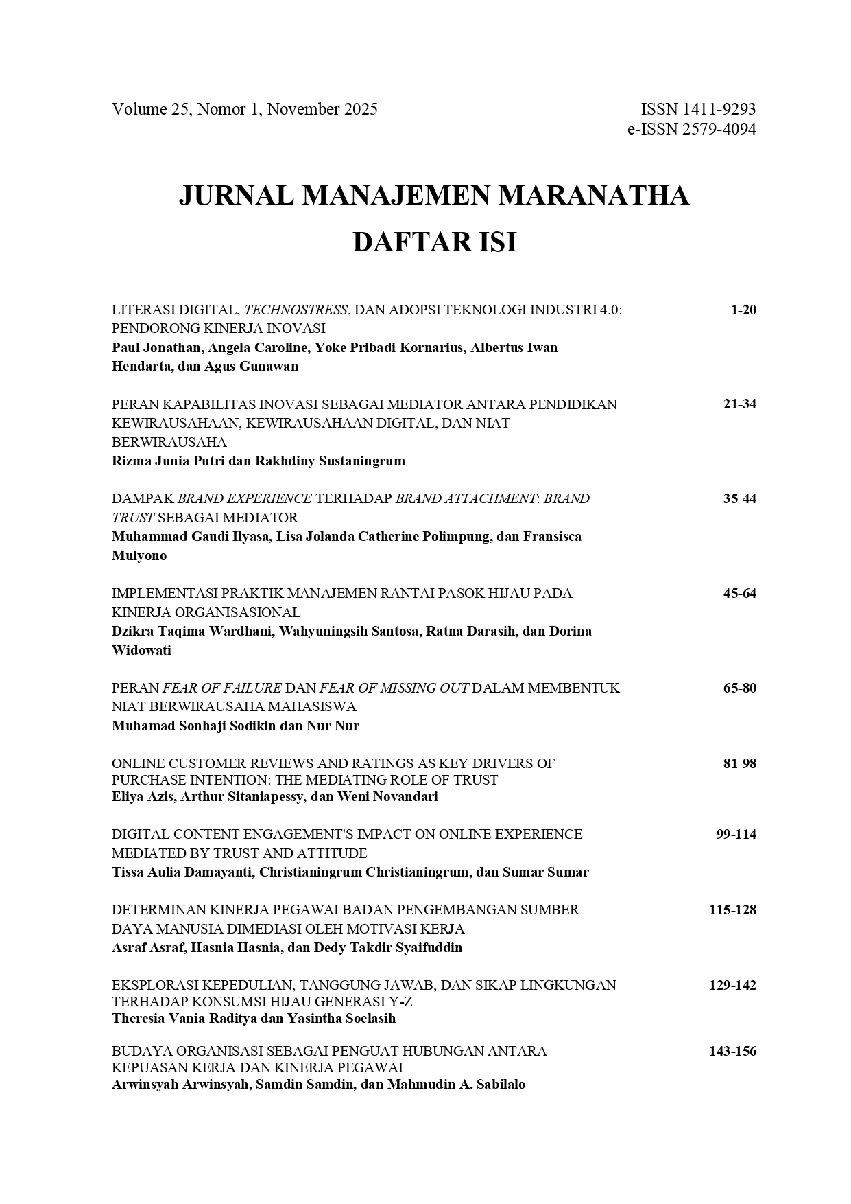 JMM, A. (2025). Table of Contents. Jurnal Manajemen Maranatha, 25(1). https://doi.org/10.28932/jmm.v25i1.13768