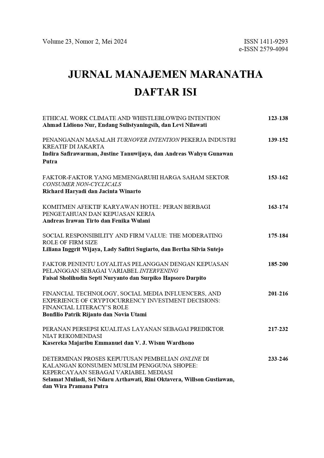 ida, I. (2024). Table of Contents. Jurnal Manajemen Maranatha, 23(2). https://doi.org/10.28932/jmm.v23i2.8918
